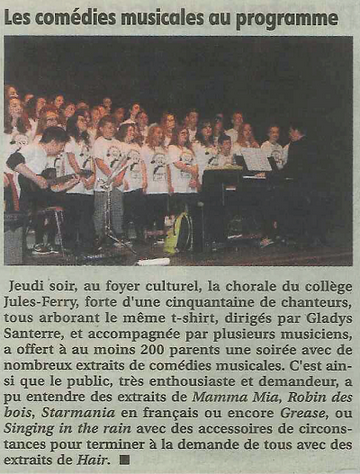 Les comédies musicales au programme. Article mis en ligne le 26 mai 2017 par Webmestre L’Echo Républicain, le samedi 20 mai 2017.