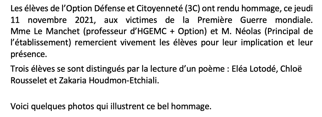 Commémoration du 11 novembre 2021 Article mis en ligne le 12 novembre 2021 dernière modification le 15 septembre 2022 par Webmestre